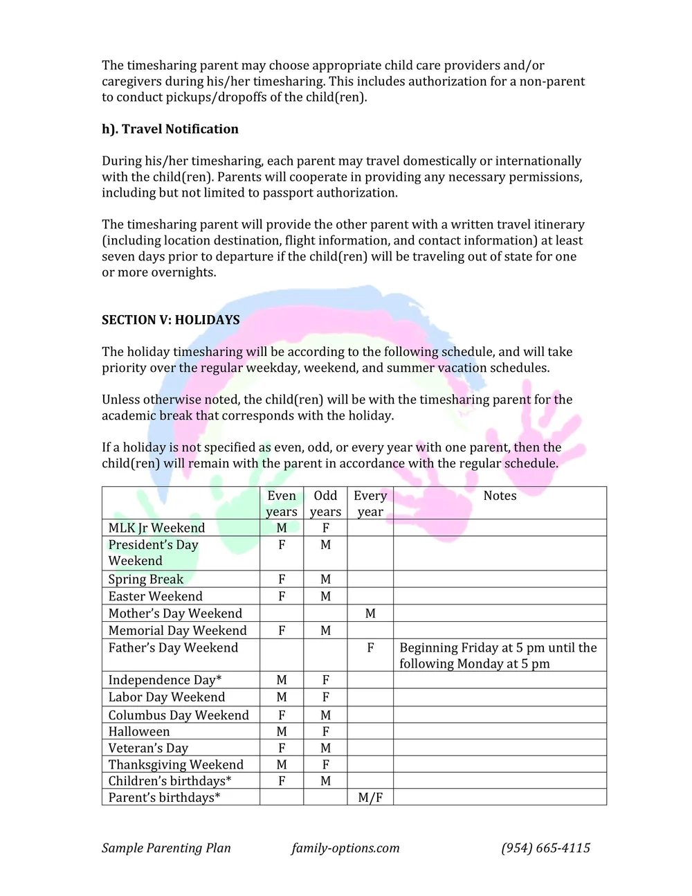 Sample Parenting Plan Florida Family Options Mental Health Services from images.squarespace-cdn.com Notice about petition to change a parenting plan, residential schedule or custody order 04/2021: When you're writing a plan, it's critical you use airtight language that leaves no room for confusion. Access the parenting plan tool. Consider the physical, emotional and social needs of your child as you make your schedule. Additional page labeled "details about parenting plan, continued." i request that the court order the remedies i selected in my motion because: This final parenting plan changes the last final parenting plan. My parenting time, or substantially violated the parenting plan, in the following way(s): Your schedule should include the daily living schedule, holidays and vacation time.